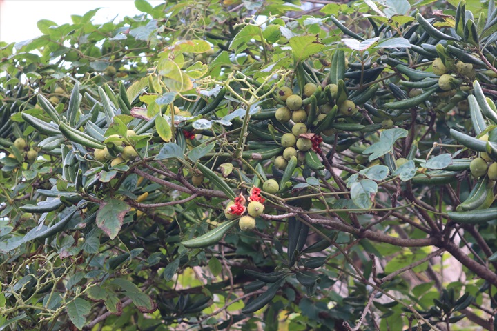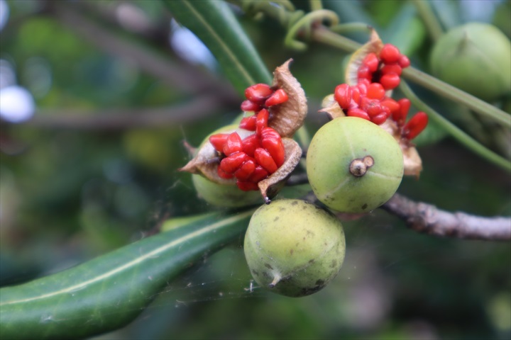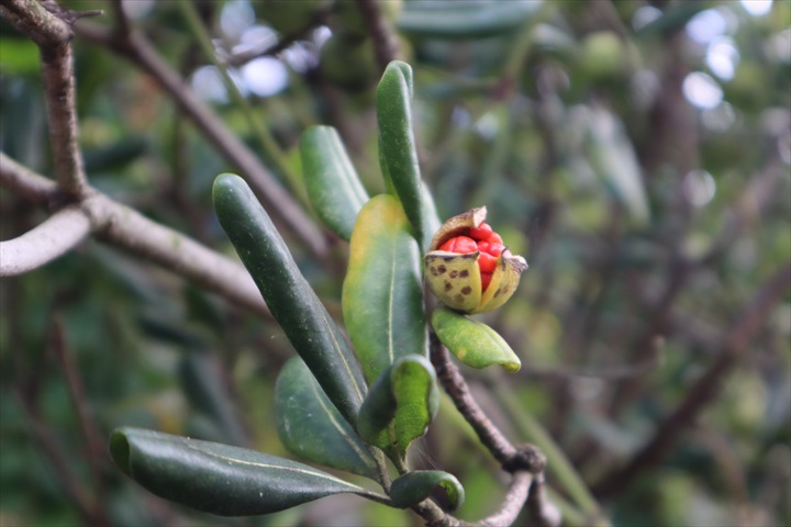 まず駐車場に植えてある木にちょうど変わった赤い実が。