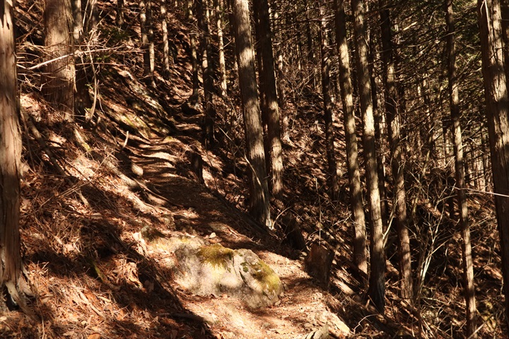 えっちらおっちら植林された杉林を登っていく。このコースは案外全般的に勾配がきつい。