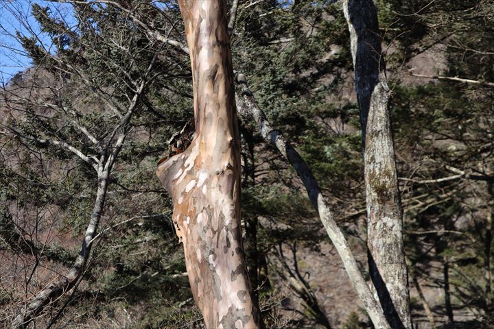 百日紅のような芸術的な肌の木。ナツツバキらしい。艶といいモザイク柄といい良き。
