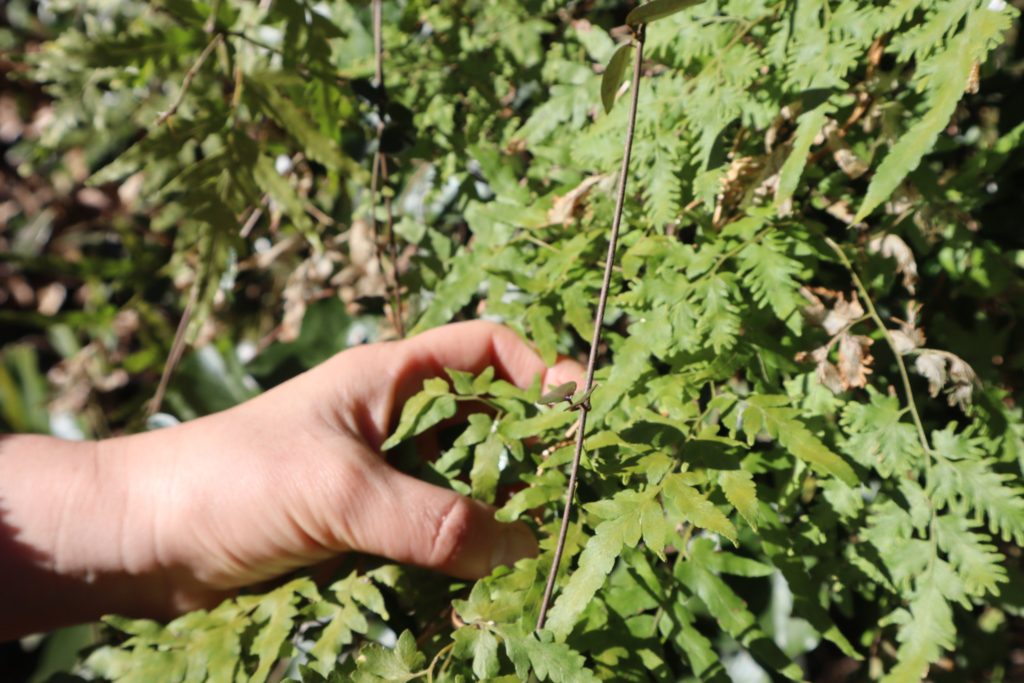 シダの種類でつる性。栄養葉と胞子葉で形が違う(切れ込み具合が)。掴んでるところは栄養葉かな。