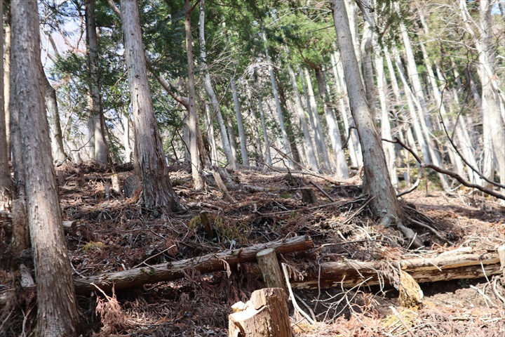 このミツバ岳はまたの名を大出山という。杉林もよく手入れされているようで、あちこちに切り出された木と切り株があった。ルートもジグザグとつづれ織りでしっかりと整備されている。