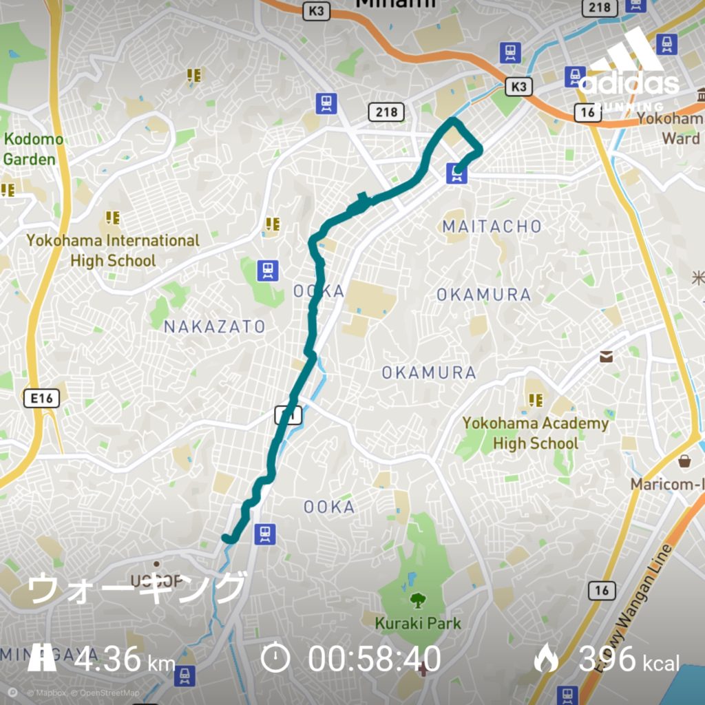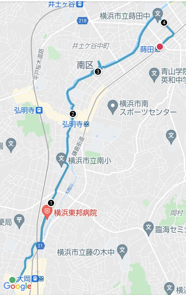 上大岡久保橋出発→本日は大岡川メイン→その割に鎌倉街道はわたらない→向田橋交差点→南小学校→すぐに、与七橋→ここからは「あるくとaruku&」のコース 大岡川沿い→花見橋→弘明寺商店街・観音橋(そのちょっと先が②km付近)→弘岡橋・大岡小学校→大井橋(ちょっと寄り道)→鶴巻橋・公衆トイレ(環状1号渡る)→蒔田橋→井土ヶ谷橋・蒔田小学校角曲がる(曲がって約④km付近)→鎌倉街道に出て右→市営地下鉄ブルーライン 蒔田駅ゴール(4.3km396キロカロリー)